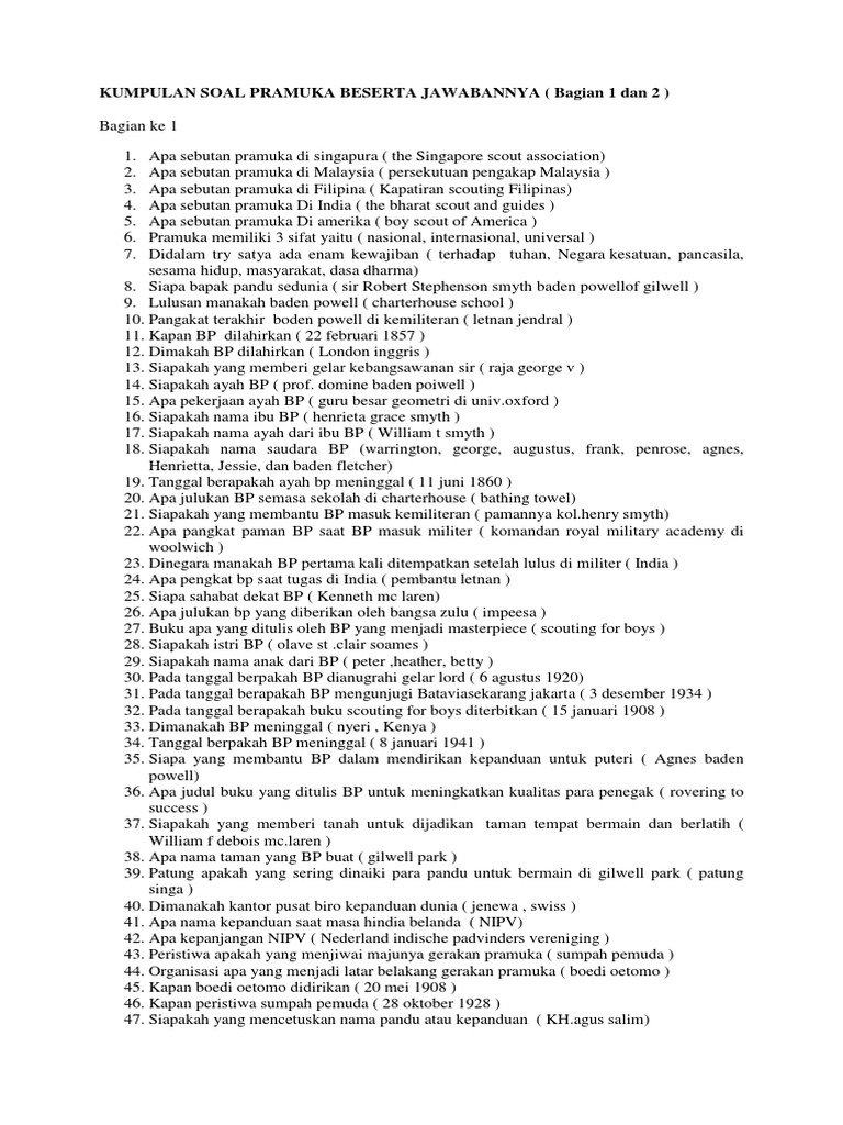 Soal rangking 1 penggalang atau soal olimpiade pramuka. Soal uas pemrograman dasar kelas 10 semester genap tahun ajaran 2014 contoh soal essay pemrograman dasar dan jawabannya kelas 10 soal dan jawaban pemrograman dasar. Pada artikel kali ini saya akan berbagi 100+ soal pas pjok kelas 8 dan jawabannya i part 1 kepada anda semua. Soal pilihan ganda pengetahuan pramuka 1. Latihan soal pengetahuan umum dan jawabannya.